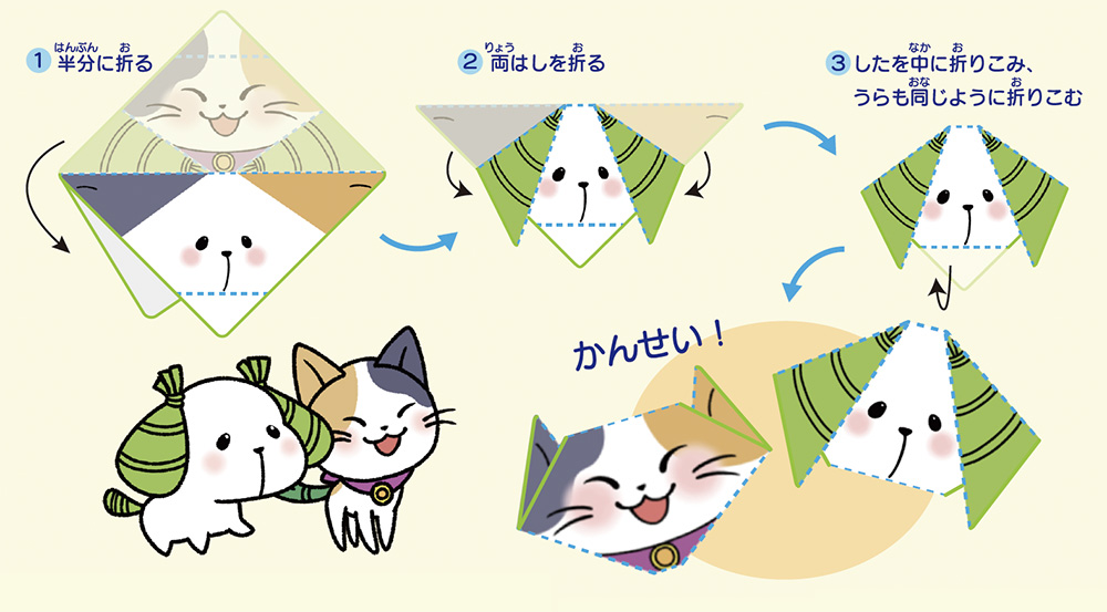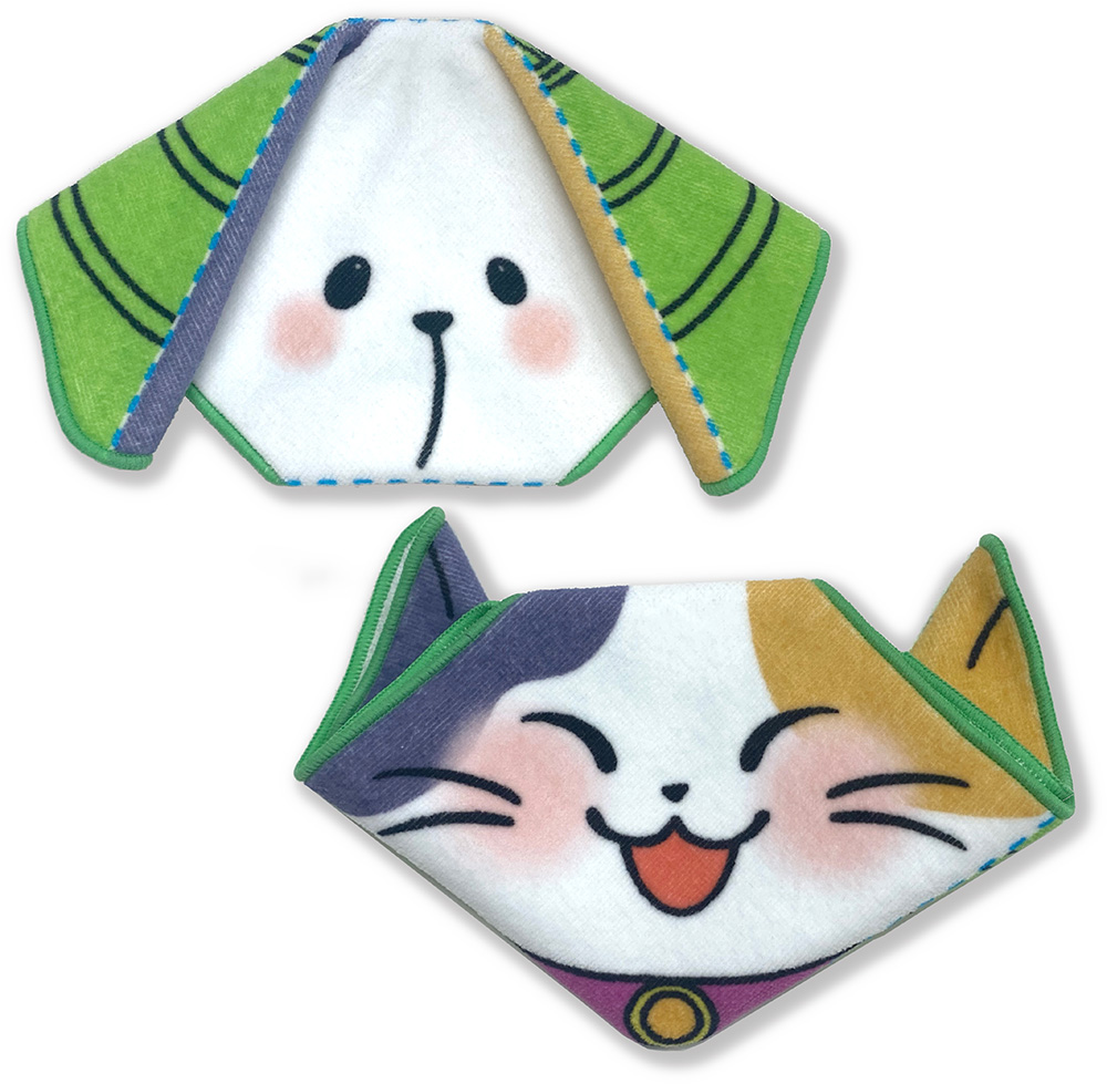 四角いハンカチを点線で折ると、ちまいぬやちまねこになっちゃうんだ!