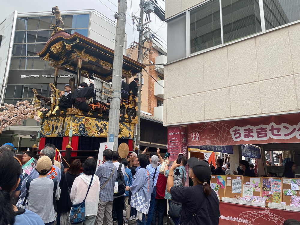 曳山巡行で先頭を行く西行桜狸山のタヌキさんが毎年天気を守ってくれている、と言われているんだって!