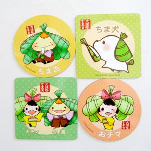 【ちま吉マグネットステッカー】だよ。4種類あるんだけど、どれもこれも素敵でしょ。君はどれがいい? 10日の宵宮、11日の本祭の【ちま吉センター】で発売されます。